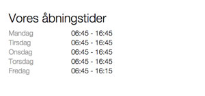 Vis jeres åbningstider på en overskuelig måde. Denne sektion opdaterer sig selv automatisk.